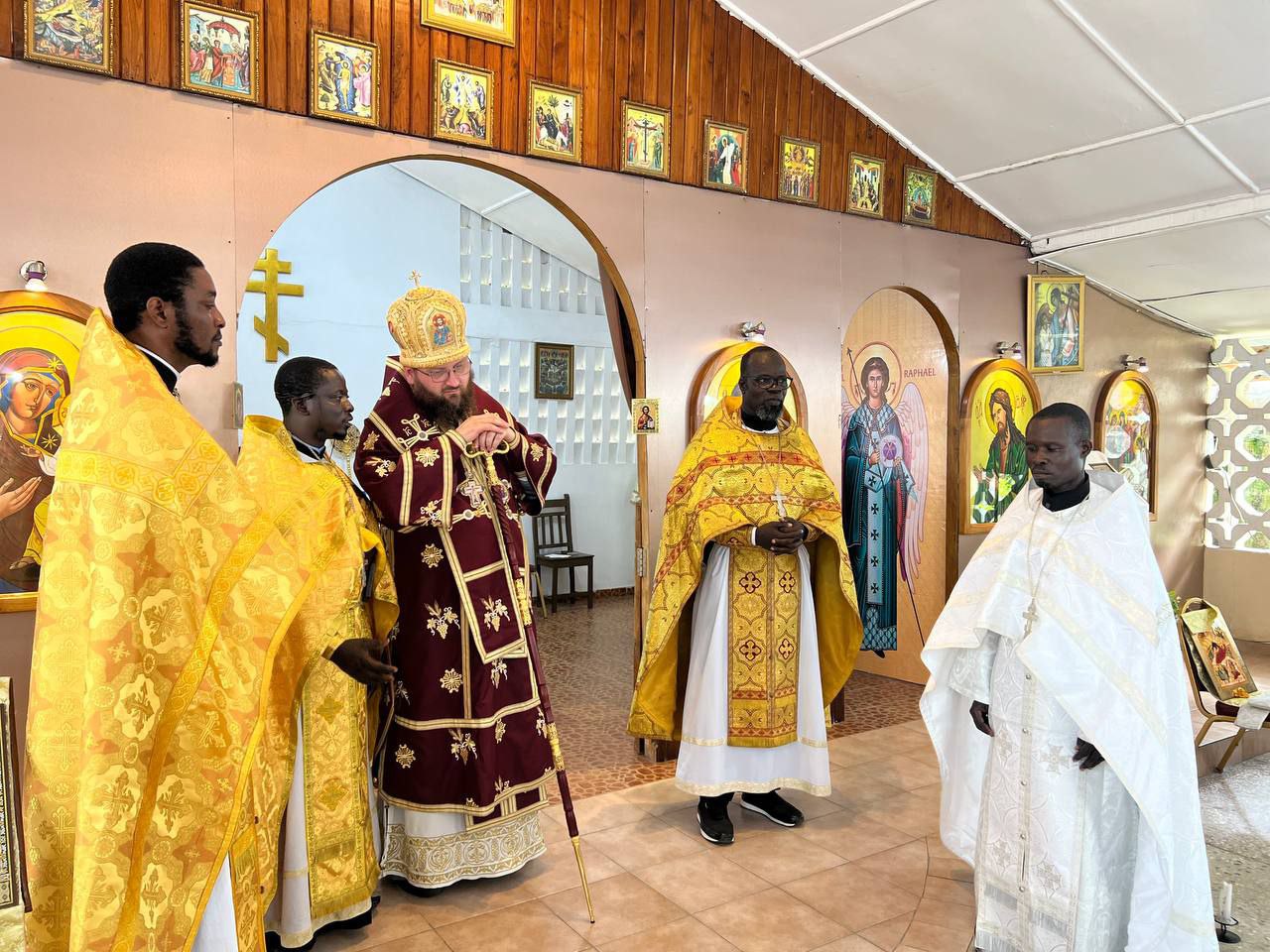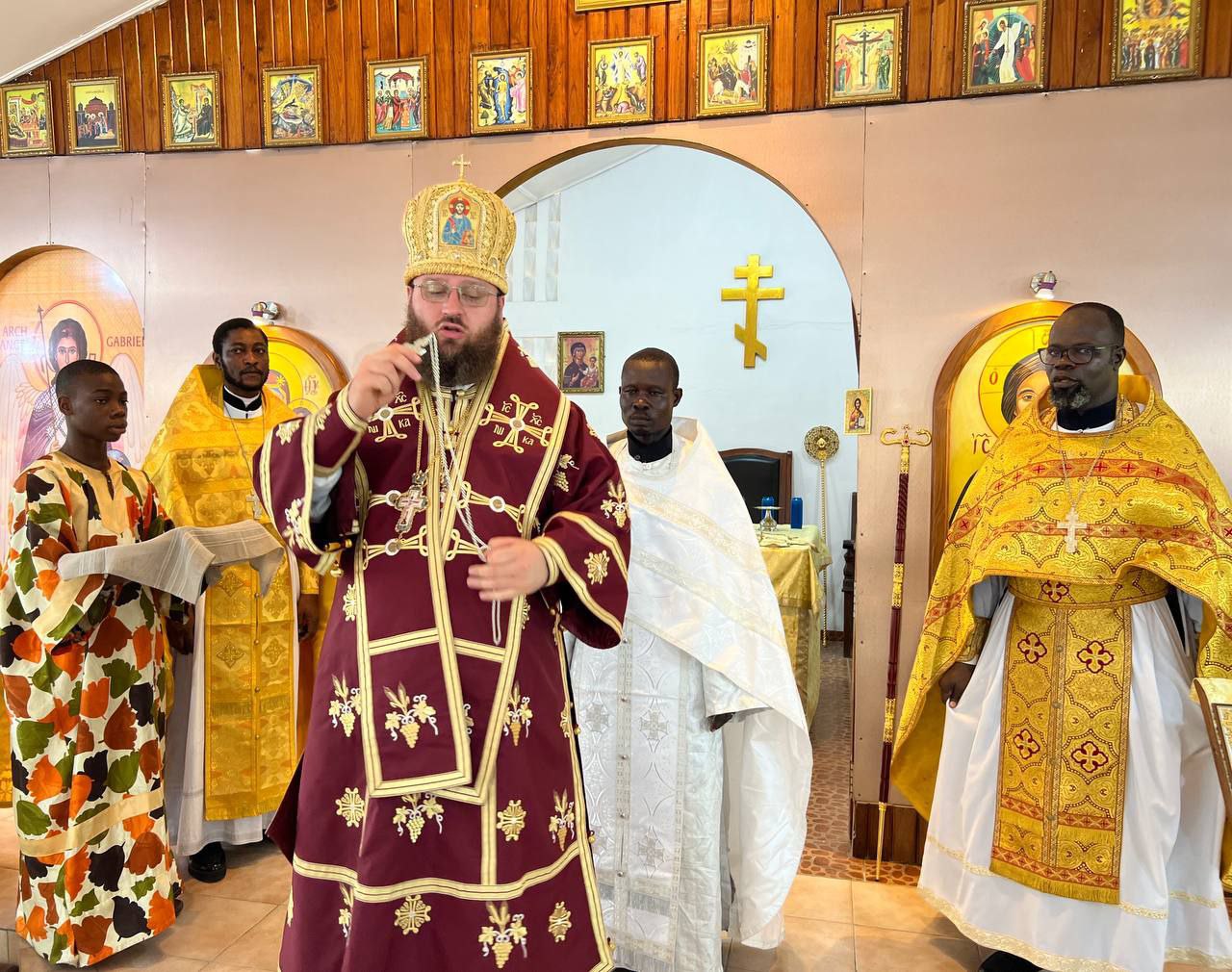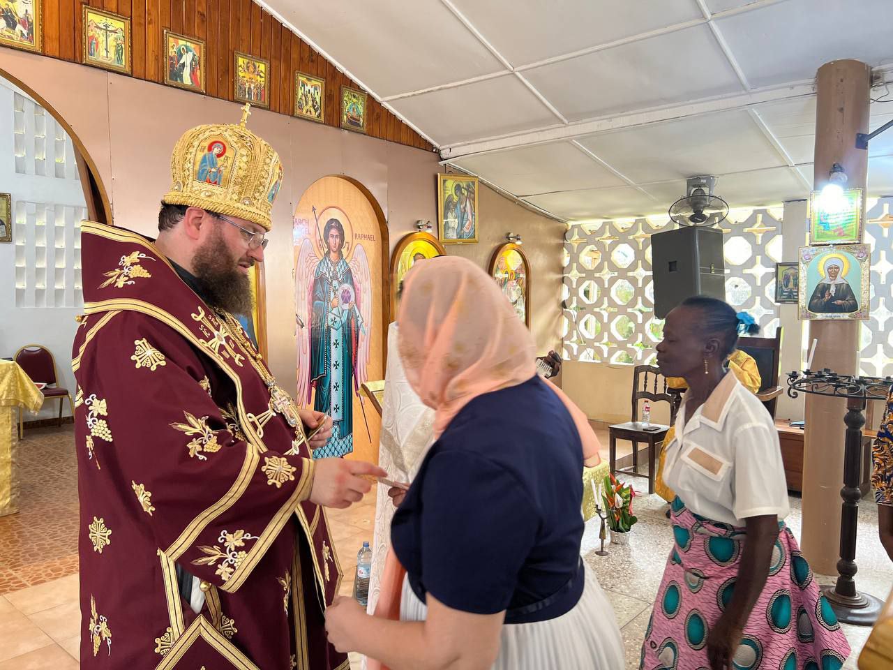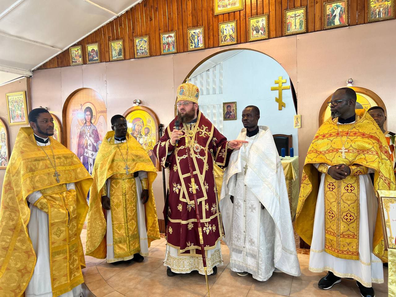 The next day, he celebrated the Divine Liturgy at the parish of the Nativity of Christ in Cotonou. Assisting him were Rev. Georgy Maksimov, chairman of the Exarchate’s Missionary Department, Rev. Parthenius Dansou, dean of the Exarchate’s parishes in Côte d’Ivoire, Burkina Faso, Benin and Togo, Rev. Daniel Agbaza, dean of the Exarchate’s parishes in Nigeria, and Rev. Stephen Assongba, rector of the parish.