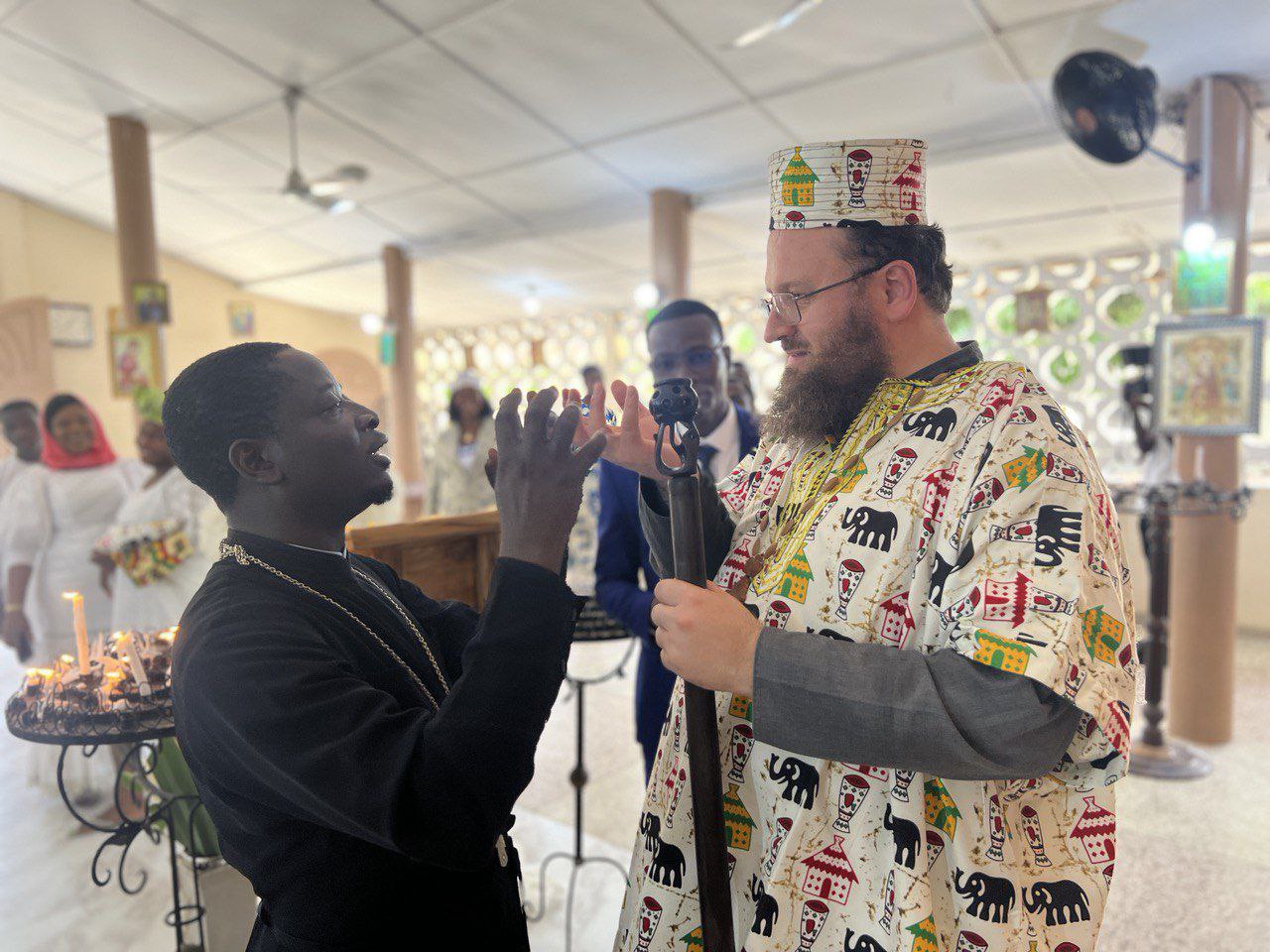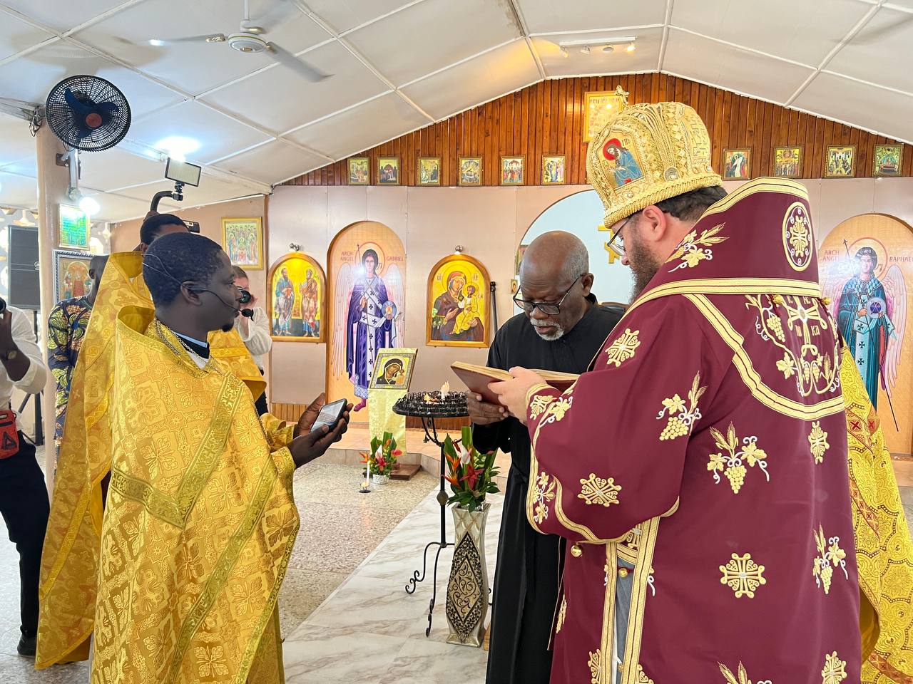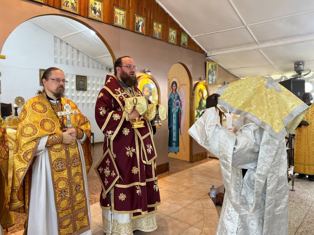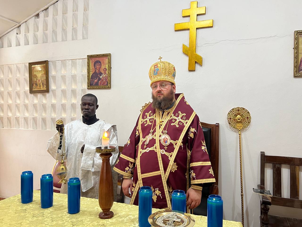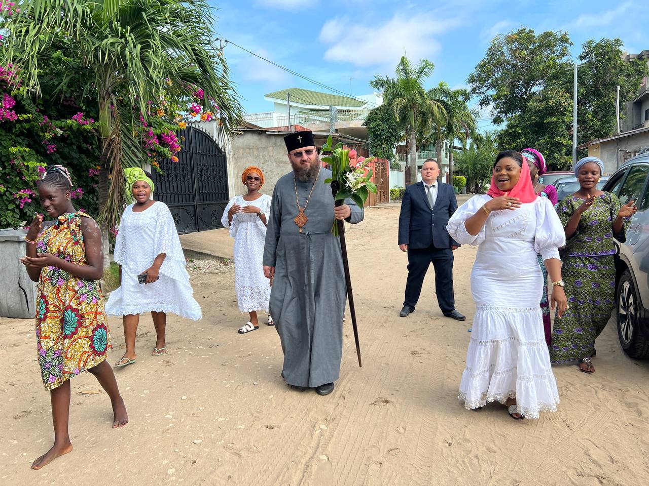The next day, he celebrated the Divine Liturgy at the parish of the Nativity of Christ in Cotonou. Assisting him were Rev. Georgy Maksimov, chairman of the Exarchate’s Missionary Department, Rev. Parthenius Dansou, dean of the Exarchate’s parishes in Côte d’Ivoire, Burkina Faso, Benin and Togo, Rev. Daniel Agbaza, dean of the Exarchate’s parishes in Nigeria, and Rev. Stephen Assongba, rector of the parish.