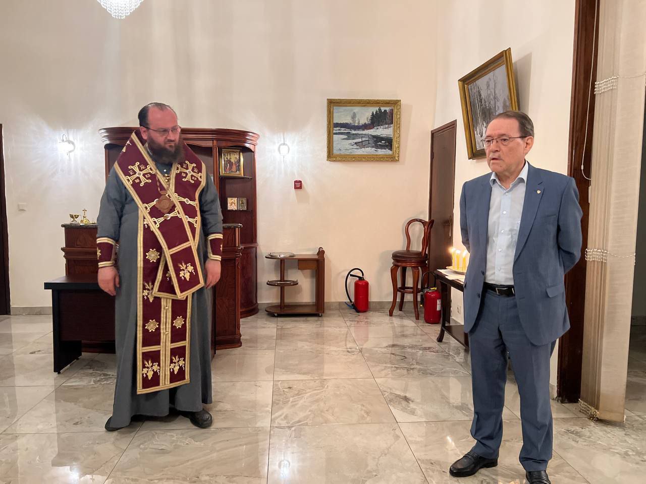 Metropolitan Konstantin presented the head of diplomatic mission and his wife with a Bible and an icon of the Most Holy Mother of God.