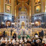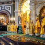 В этот знаменательный день Святейший Патриарх Кирилл совершил Божественную литургию в кафедральном соборном Храме Христа Спасителя в Москве в интронизационных облачениях и с копией жезла святителя Петра.