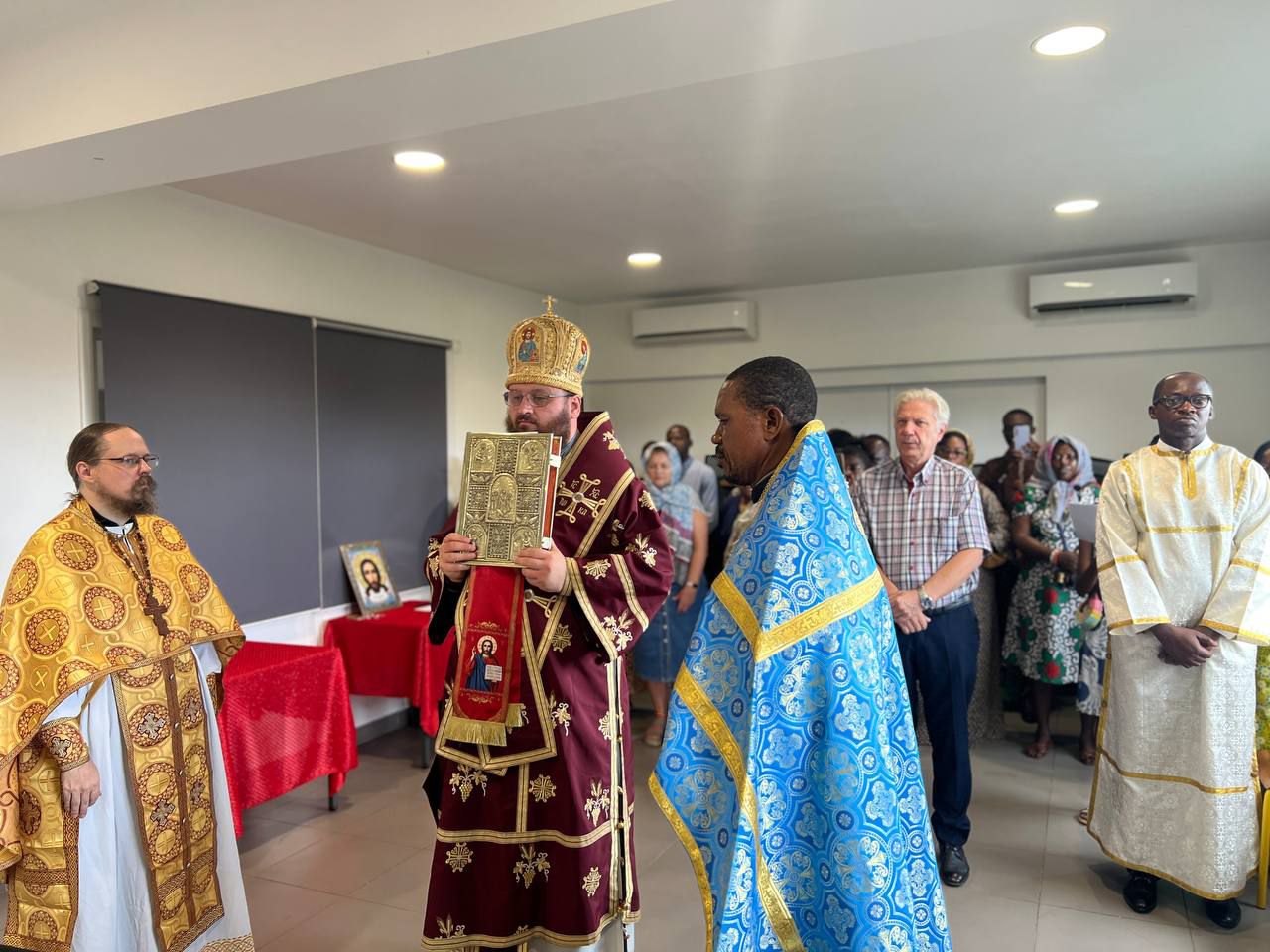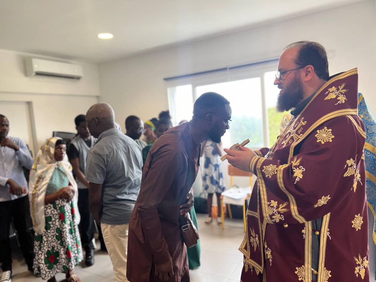 Архиерею сослужили председатель Миссионерского отдела Патриаршего экзархата Африки иерей Георгий Максимов и настоятель храма иконы Божией Матери «Знамение» г. Нтума иерей Афанасий Эбелебеле.