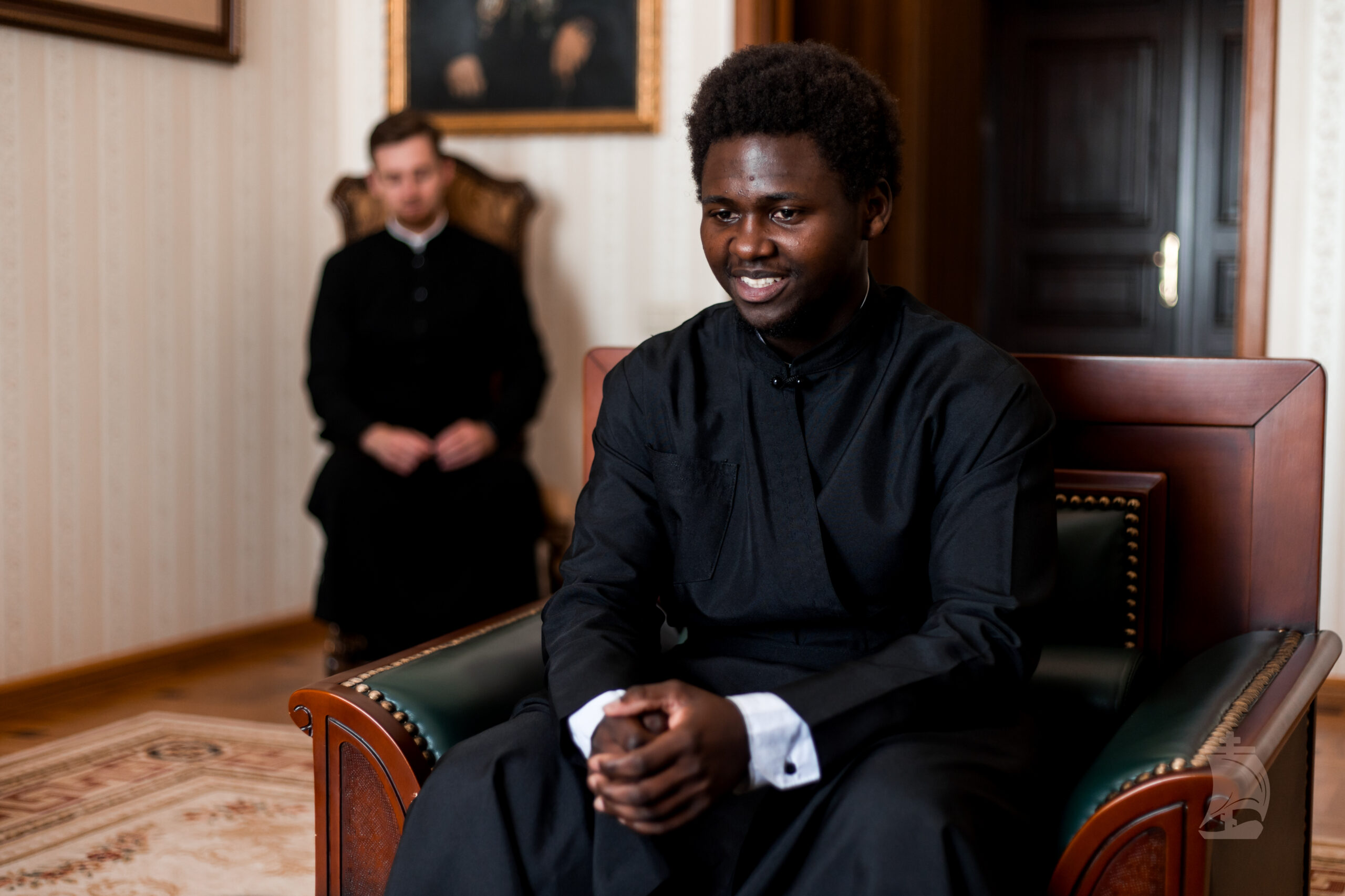 В беседе принимали участие протоиерей Димитрий Сизоненко, руководитель Международного отдела акадамии, чтец К.Д. Гордица, председатель Отдела по работе с иностранными студентами Патриаршего экзархата Африки и Иванов Иван, аспирант, методист отдела по работе с иностранными студентами.