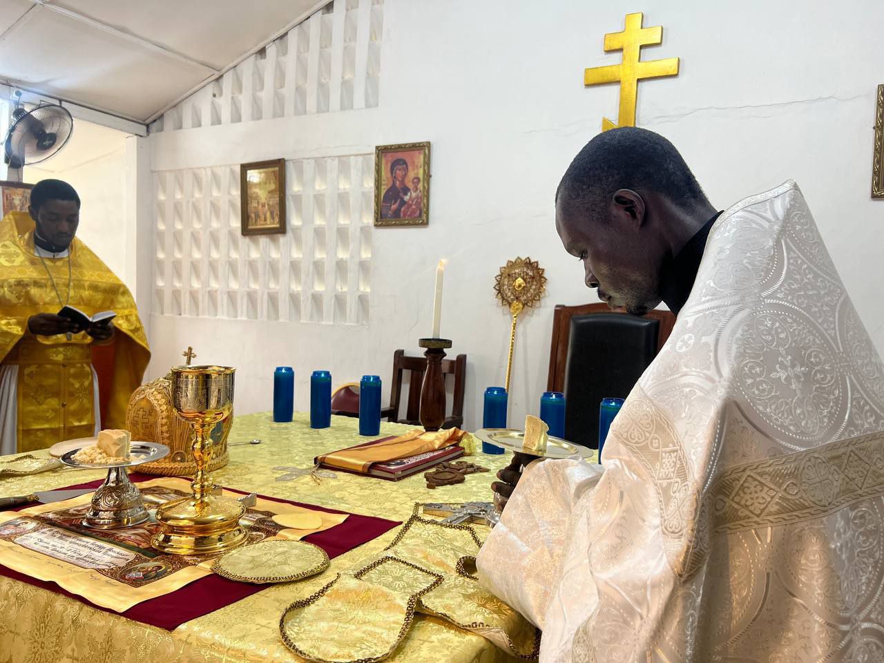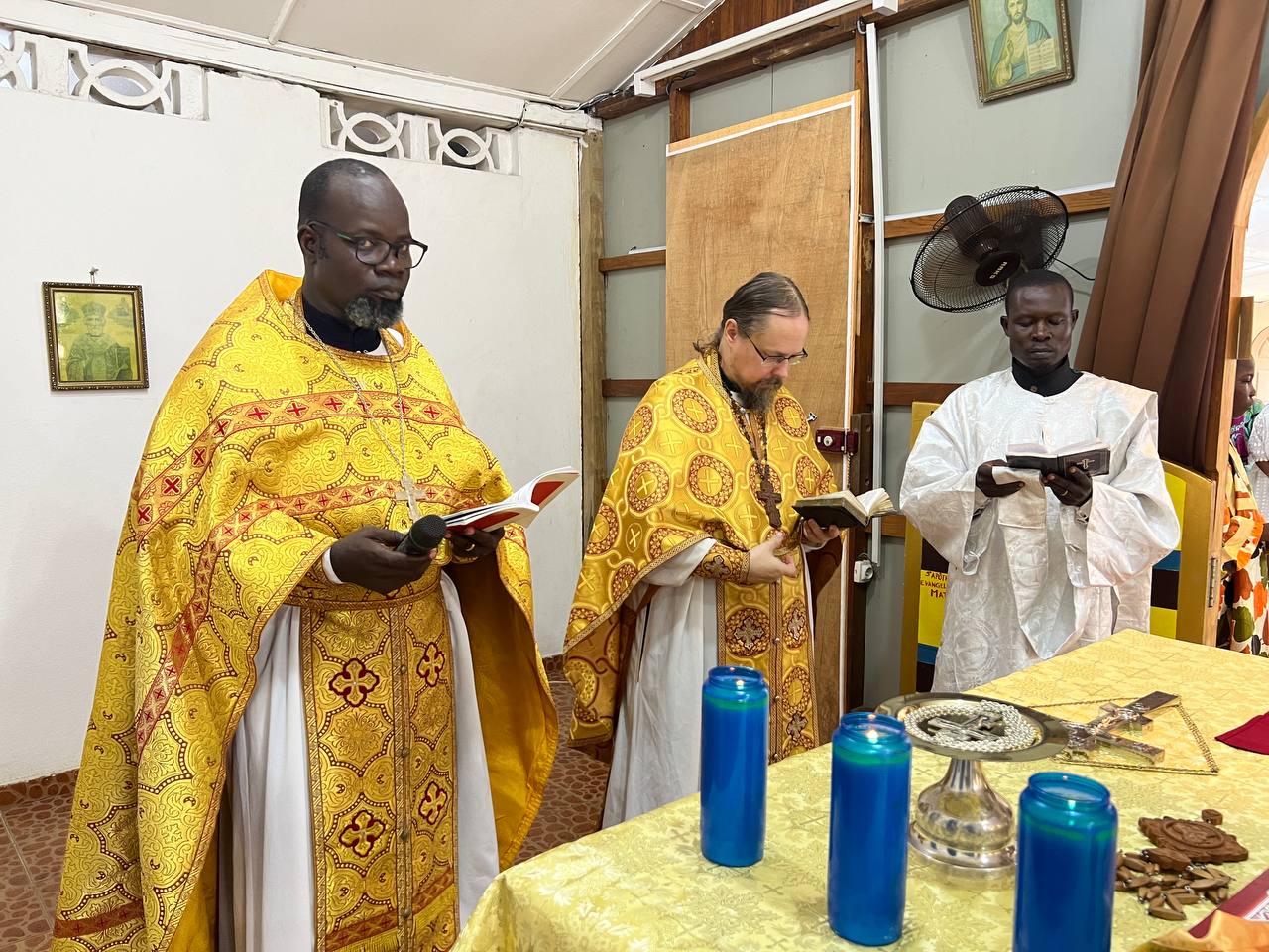Его Высокопреосвященству сослужили председатель Миссионерского отдела Патриаршего экзархата Африки иерей Георгий Максимов, благочинный приходов экзархата в Кот-д’Ивуаре, Буркина-Фасо, Бенине и Того иерей Парфений Дансу, благочинный приходов экзархата в Нигерии иерей Даниил Агбаза и настоятель прихода иерей Стефан Ассонгба.