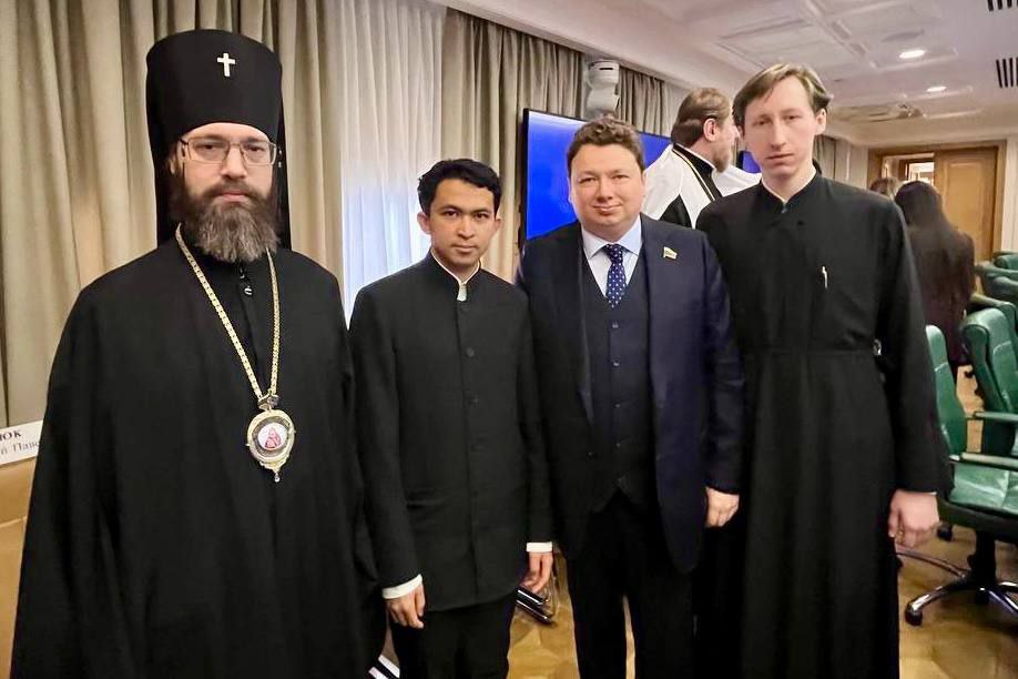 Среди участников круглого стола были преподаватель кафедры истории и гуманитарных дисциплин Николо-Угрешской духовной семинарии А.Б. Банин и студент 2-го курса бакалавриата из Республики Мадагаскар Фома Анжело.